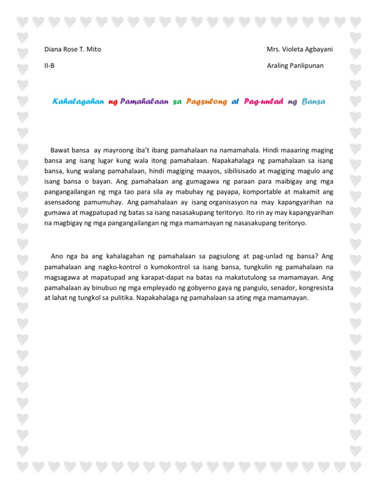 Ngunit ang isang uri ng pagmamahal na di matatawaran ay ang pagmamahal sa bayan. 2020-02-12 Sanaysay tungkol sa kahalagahan ng edukasyon sa panahon ng pandemya - 7951519 Answer. Magpasa ng resolusyon na kinakailangan upang maisakatuparan ang layunin ng mga kabataan sa barangay alinsunod sa mga naakmang tuntunin nakasaad local government.