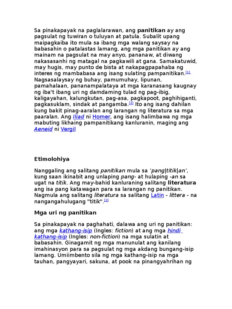 Ang kabuuan ng sulatin gaano man kahaba ay iisa lamang ang paksa nito. Ang saling Ingles nito ay Literature. Ang pagkakaiba nito ang panitikan ay tungkol sa pagsulat ng tuwiran tuluyan at patula tungkol sa mga paksa noon hanggang kasalukuyanAng kasaysayan naman ay tungkol sa pag-aaralpag-tala ng impormasyon sa mga pangyayari sa nakaraanSapagkat sila ay magkasama dahil kung walang panitikanwalang kasaysayandahil sinusulat ng mga manunulat ang mga.