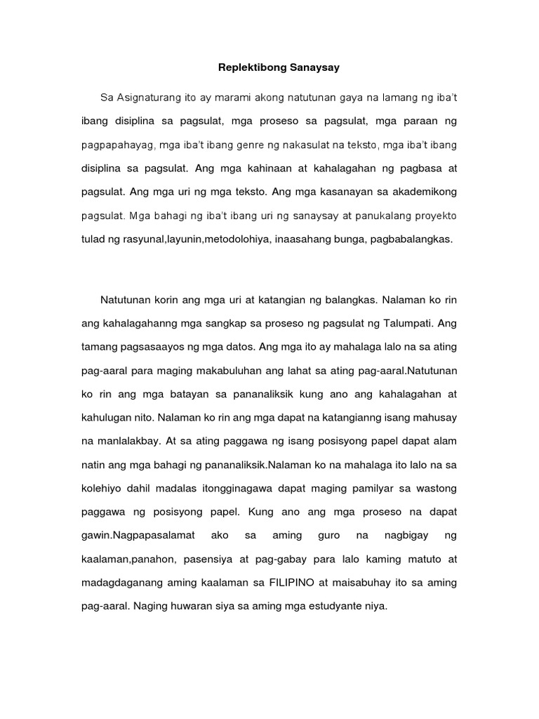 Replektibong sanaysay Ang aking natutunan sa pag gawa ng akademikong sulatin ay kung paano gumawa ng pormal na papael. Nagpapasalamat din sila sa kay Gng. Sa pamamagitan naman ng pagsulat ng sariling sulatin bilang ambag sa akademikong larangan at maging sa pang-araw-araw na buhay mapapaunlad at mapapahalagahan natin ang pagsulat sapagkat hindi nayin ito binabalewala kundi ginagamit natin upang mapaunlad ang ating kasanayan sa pagsulat gamit ang ating kaalaman.