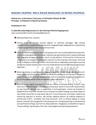 Itong tinatawag nating Inang wika na kung saan ay ang Tagalog ang naging tulay ng bawat Pilipino. Ang pag-aaral na ito ay naglalayong malaman ang lawak ng pagpapahalaga ng mga estudyante sa asignaturang Filipino kaugnay ng kanilang akademik performans. 07012021 Ang BAYANIHAN ay tatak Filipino na malawakang mauunawaan at nagpapatatag sa mga lokal na.