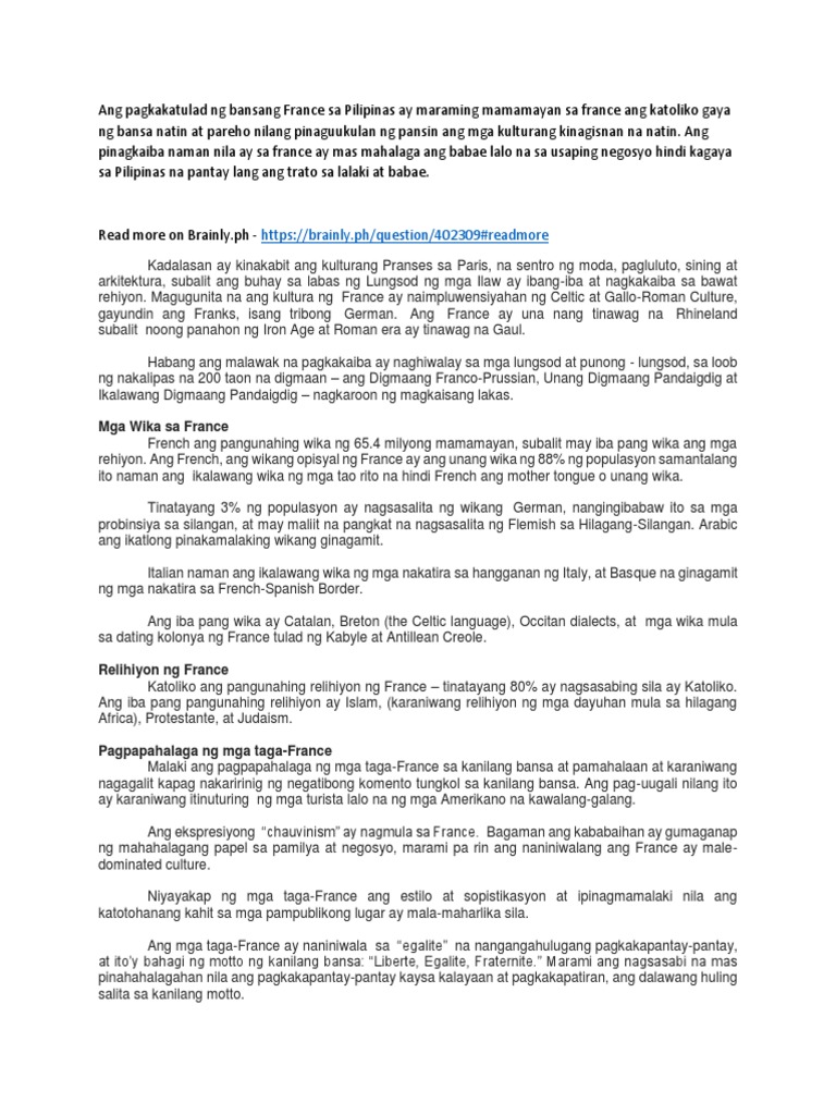 Ang Pagkakatulad Ng Bansang France Sa Pilipinas Ay Maraming Mamamayan Sa France Ang Katoliko Gaya Ng Bansa Natin At Pareho Nilang Pinaguukulan Ng Pansin Ang Mga Kulturang Kinagisnan Na Natin Pdf