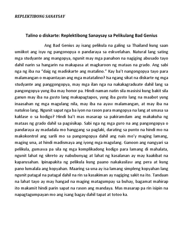 Hindi ko maikakaila na ako bilang estudyante ay nabibihag din ng mga luhong ito sa paraan na hindi ko nababatid lalong lalo na ng mga maliliit na bagay. Ni Angelica Dañoso The Bad Genius Ang palabas na ito ay talagang kapupulutan ng aral maraming bagay at emosyon ang naglaro. Ay tinatawag ding repleksyong papelItoy pasulat na presentasyon ng kritikal na repleksyon o pagmumuni-muni tungkol sa isang tiyak na paksa.