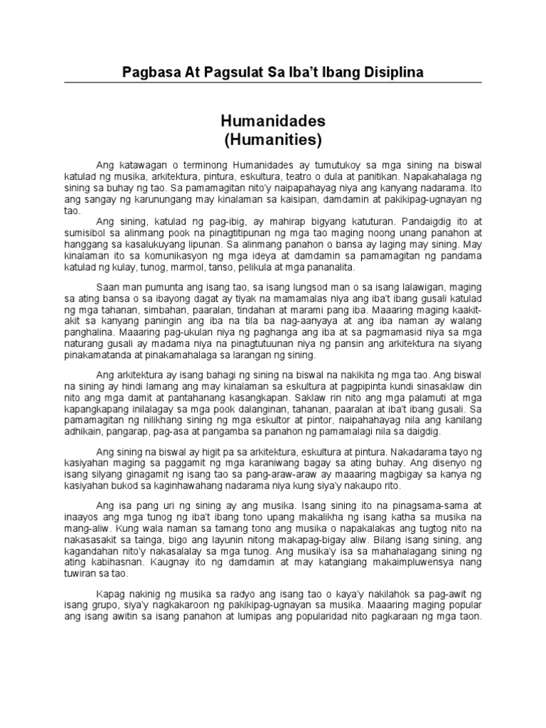 Humanidades Humanities Ang Mg a Ara li ng Na uuk ol Sa Tao O Mg a Ara li ng Pan tao Humanidades tumutukoy sa mga sining na biswal katulad ng musika arkitektura pintura eskultura teatro o dula at panitikan. 2Naiisa-isa ang kalikasan at katangian ng nilalaman Ang ILAN. Halimbawa ng isang Sanaysay sa Filipino.