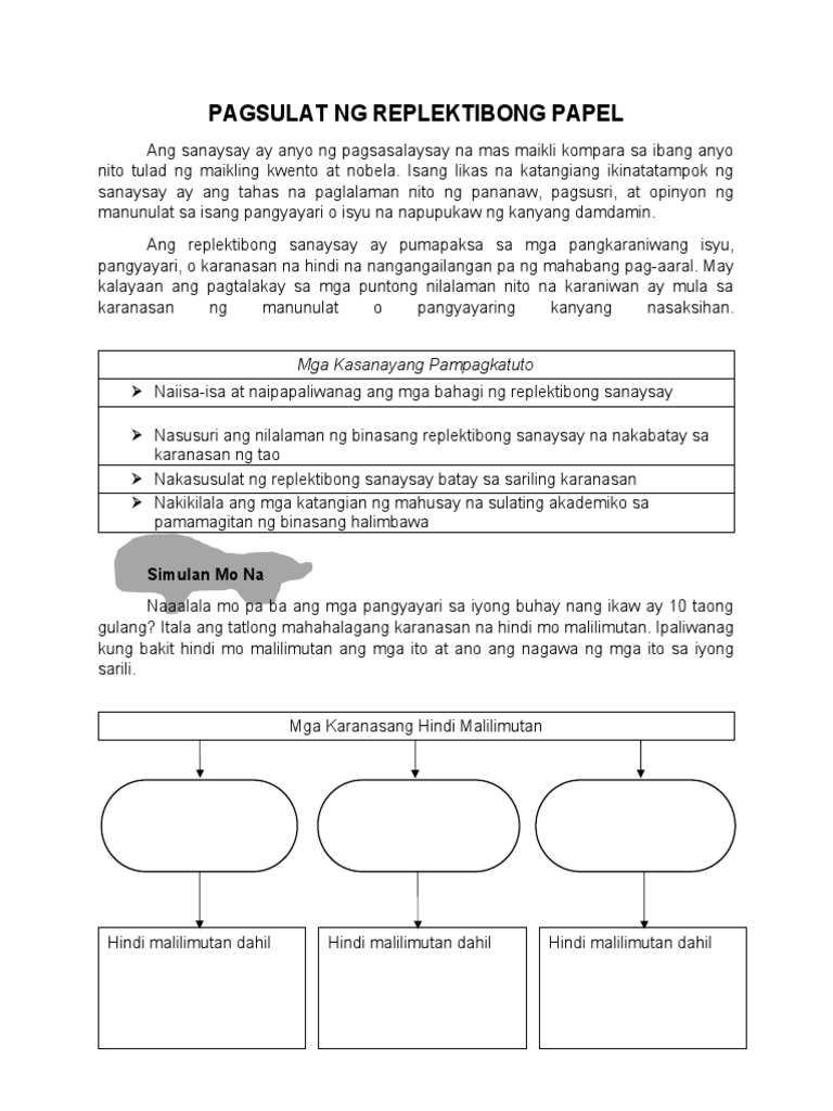 Anong mga mahahalagang aral ang makikita sa nobelang ginawan ng replektibong sanaysay. Paano naiiba ang replektibong sanaysay sa iba pang uri ng sulatin. Ang pokus nito kadalasan ay ang impormasyong nais ibigay at ang mga argumentong nais gawin sa halip na manunulat mismo o ang kanyang mambabasa.