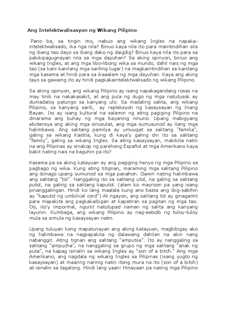 Sanaysay tungkol sa intelektwalisasyon ng wikang filipino. Malaki ang nagagawa ng wika sa pagkakaroon ng magandang unawaan ugnayan at mabuting pagsasamahan. Kahit saan mang sulok ng Pilipinas ay may kanya-kanyang wika na ginagamit ang bawat mamamayang Pilipino. Ang ideya konsepto teorya modelo o paradigm prinsipyo o pilosopiya na pawang resaresa intricacies ng karununganna likha ng epistemolohiyang Filipinoat ginagamit ng sambayanang Pilipino sa pamumuhay ay tiyak na.